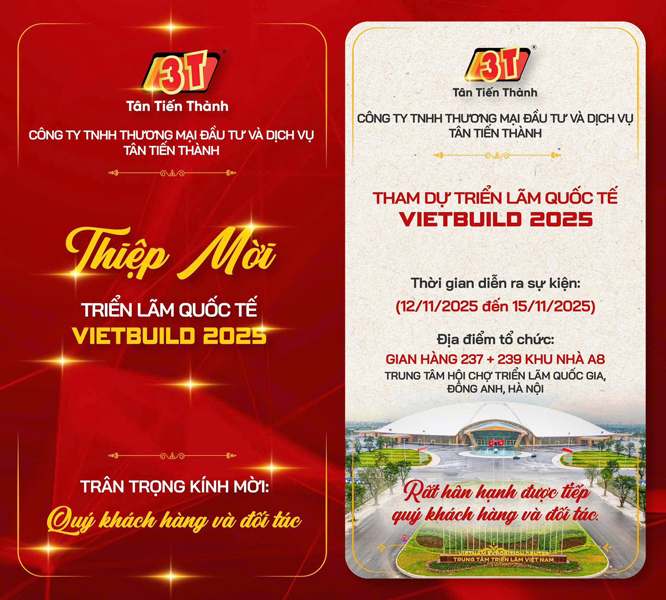 Tân Tiến Thành tham gia Vietbuild Hà Nội 2025 (Lần IV) tại Trung tâm Triển lãm Việt Nam, trưng bày bộ sản phẩm 3T chính hãng tại gian hàng 237–239, Sảnh H8. Nhận phản hồi tích cực từ khách tham quan, ký kết hợp đồng và mở rộng mạng lưới đối tác.